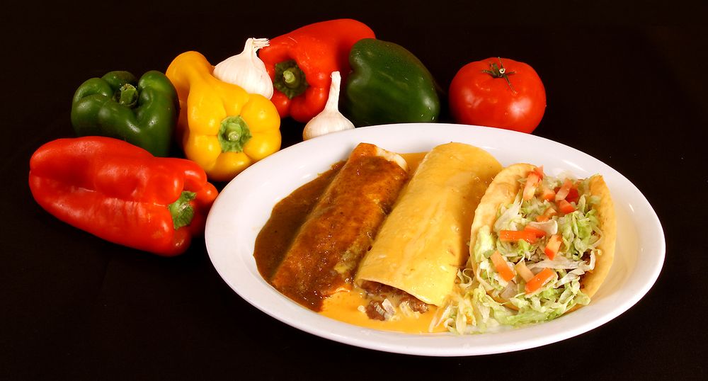 8 inch flour tortilla filled with a mixture of seasoned ground beef, cheese, and lettuce, smothered with cheese, red or green chili or all three. Served with beans and rice.