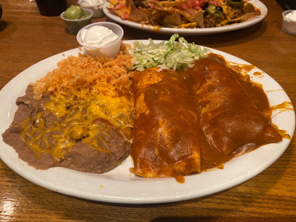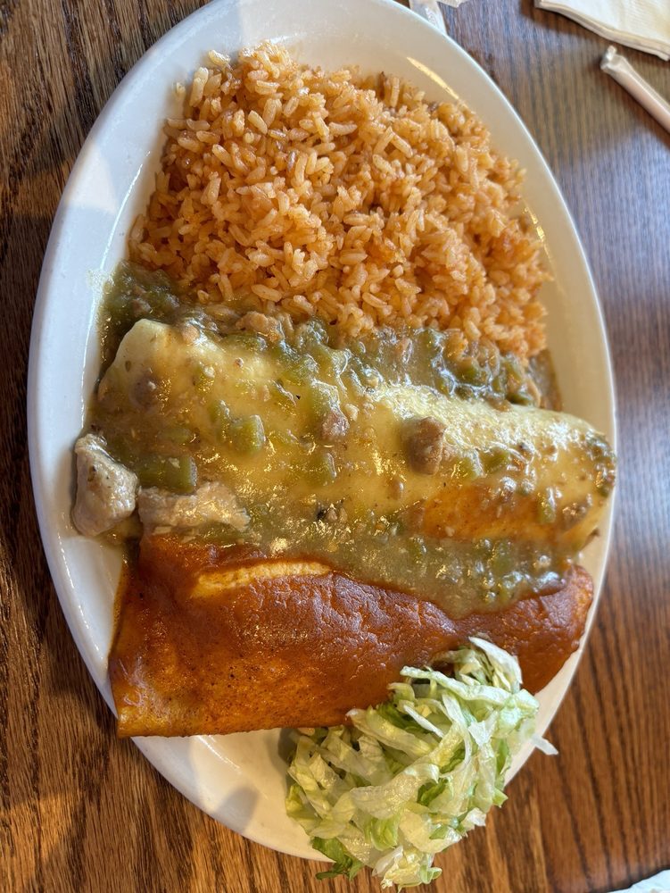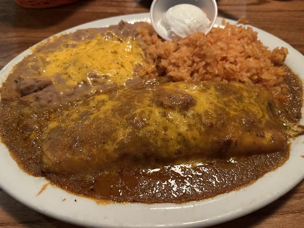 8 inch flour tortilla filled with a mixture of seasoned ground beef, smothered with cheese, red or green chili or all three. Served with beans and rice.