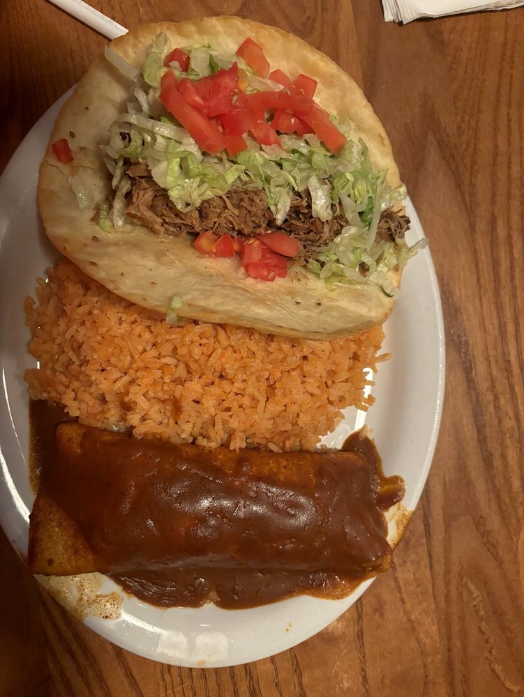 A lightly fried 8 inch flour tortilla filled with seasoned ground beef, cheese, lettuce and tomato. Served with beans tomato.